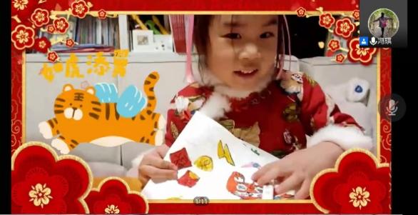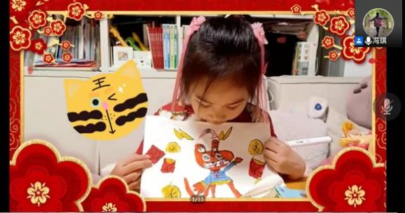 本轮游戏结束后,孙如意老师的女儿为大家带来了绘画讲解——《虎年大吉大利》,小朋友用家人的名字组成了“如虎添翼”的美好祝福,精巧又用心。