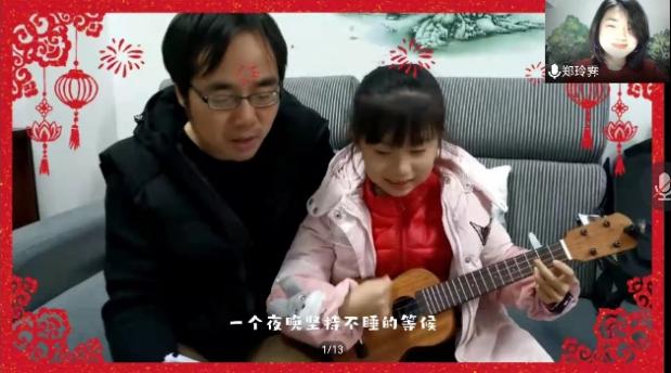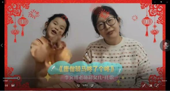 紧接着,教工第二个小家庭李文博老师和她的女儿带来了儿歌《唐僧骑马咚了个咚》,母女也是配合默契,欢快的儿歌带大家仿佛回到了美好的童年。