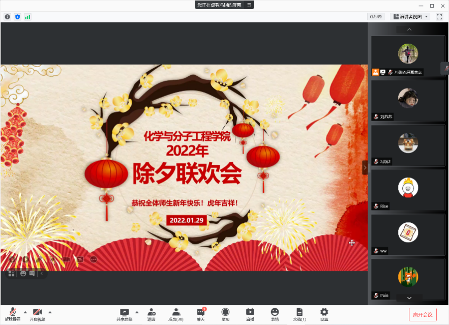 激情点亮除夕,欢乐尽在化院。1月29日(周六)晚7点,太阳成集团tyc334552022年除夕联欢会于线上顺利开展,经理田阳、公司党委书记鲜跃仲和200余位师生在线上“云”团圆。