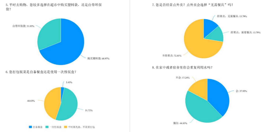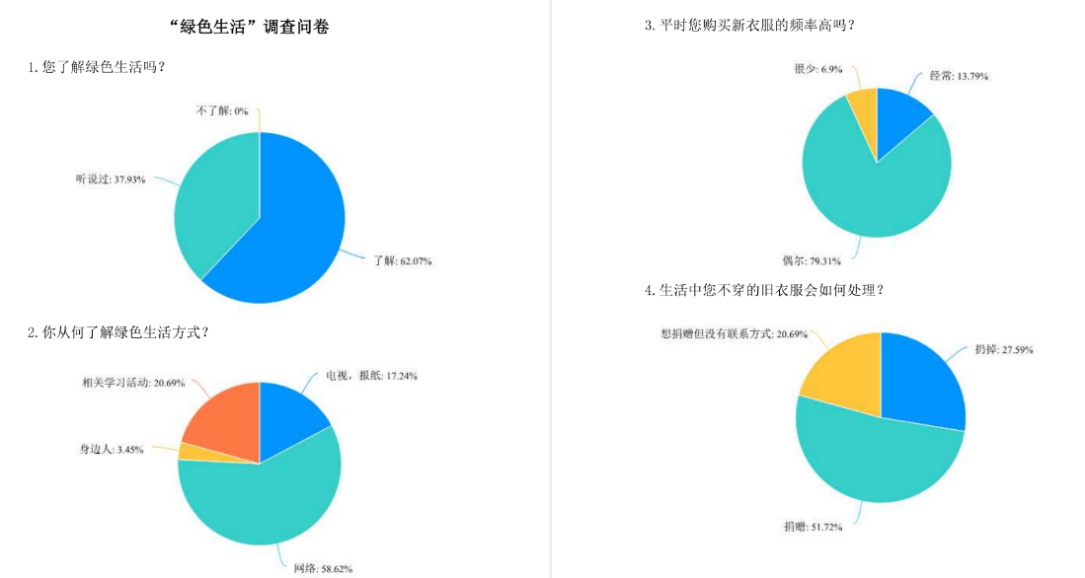 实践小组于活动前制定了详细的计划,并在活动中相互协作、执行有序。首先,队员们完成了线上调查问卷的制作与发放,通过向居民们发放问卷,收集到了不同年龄段、不同城市的居民对于环保的看法。随后,队员们根据所得数据,对居民的环保意识做出了相应的分析,并根据分析结果,有针对性地提出了下一步实践方案。