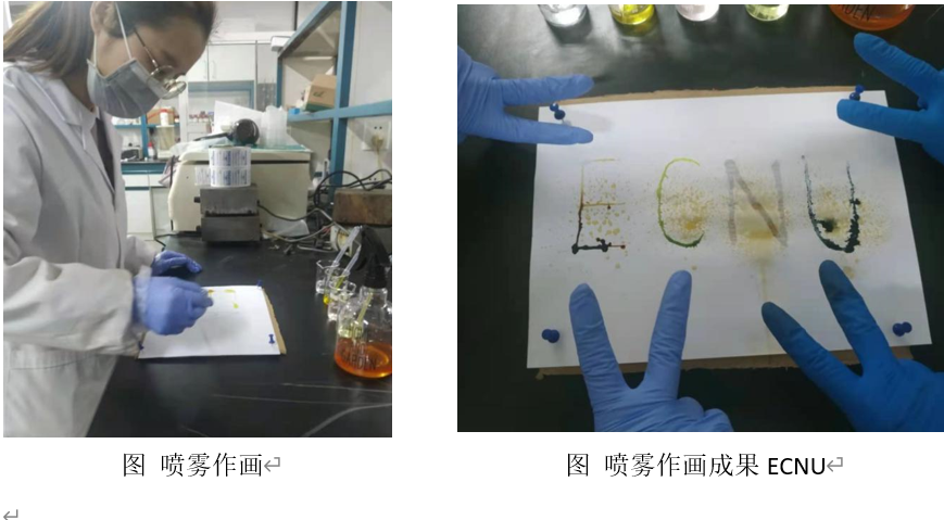在实验中,队员们用玻璃棒分别蘸取硫氰化钾溶液、亚铁氰化钾浓溶液、铁氰化钾浓溶液和苯酚浓溶液,在白纸上画出创意“ECNU”字样,然后把纸晾干,钉在瓦楞纸板上,最后,用装有三氯化铁溶液的喷瓶在艺术品上喷上三氯化铁溶液,一番操作后,我们可以惊奇地发现每个字母上分别显示了不同的颜色。