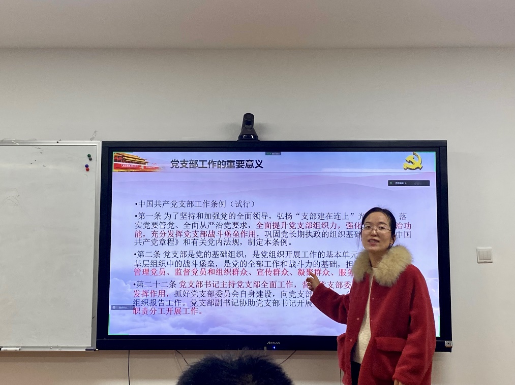 随后,院专职组织员曹美萍梳理了支部基础党务工作中的注意事项,强调了要大力推进党员的精细化管理、从严从实开展组织生活。同时,曹美萍对本学期党员发展和转正的相关问题和支部书记进行了交流沟通。