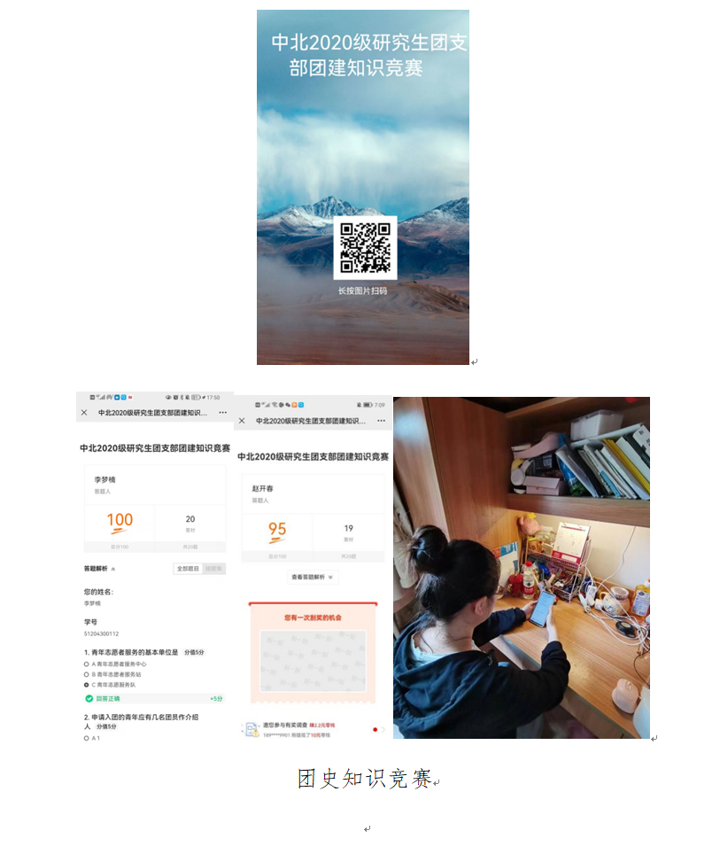为学习和响应习总书记在庆祝中国共产主义青年团成立100周年大会上的讲话精神,中北2020级研究生团支部于5月13日开展了一次特别的团日活动——团史知识竞赛。在团支书的带领下,支部各青年团员通过竞赛活动回顾了我们共青团百年历史,涉及对团组织中团徽意义、基本任务、组织原则、历史沿革、团员要求、组织机构等各方面知识,同学们通过活动,重新对中国共产主义青年团有了更为全面而系统的认识。支部团员踊跃参与此次活动,学习氛围浓厚,效果良好。