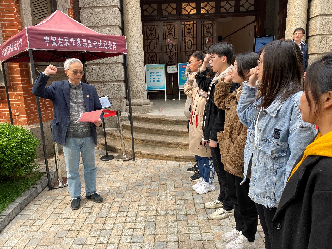 在中国左翼作家联盟会址纪念馆,新发展的员工党员在老党员何品刚教授的带领下,面对党旗、举起右手,庄严地立下了“为共产主义奋斗终身”的誓言。公司党委书记鲜跃仲在党旗下勉励入党积极分子“以更加严格的标准要求自己,争取早日入党”;要求新发展的预备党员要“争当一面旗帜,在学习工作中发挥党员先锋模范引领作用”。在简短而庄严的仪式中,同学们经受了思想洗礼,领悟了“一名党员,一面旗帜”的深刻内涵。
