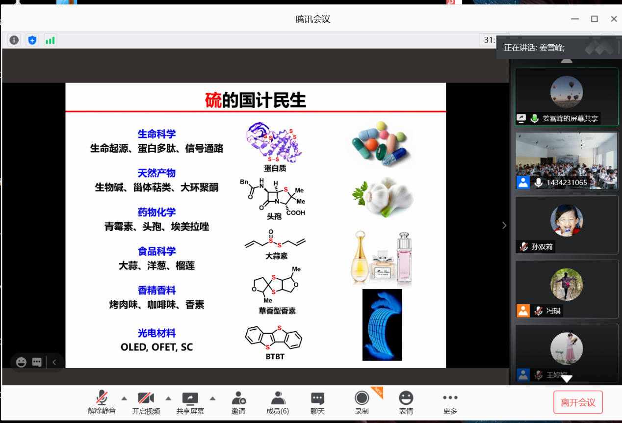 随后,姜老师通过介绍周期表中的重要元素,向同学们逐步揭开了化学的神秘面纱。以16号硫元素为例,姜老师介绍了硫元素在宇宙、地壳、人体中的分布,阐明了硫与我们的生命、国计民生息息相关。姜老师谈到,我们衣食住行等生活的各方面都有硫元素的身影,例如1/3的香精香料都含有硫,手机、笔记本电脑的显示器等光电材料中都有硫的共轭结构,药物、煤、石油乃至于温泉、火药都有硫的存在。同时,姜老师也提及了目前存在的硫化难题。事物都有两面性,姜老师通过介绍硫元素多样性,揭示了元素的复杂性,阐释了学习化学、了解元素并在生产生活中合理利用元素的重要性。
