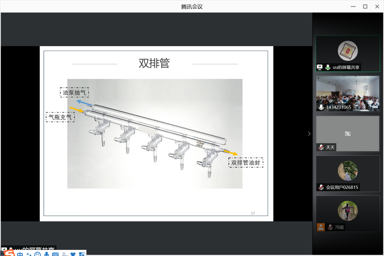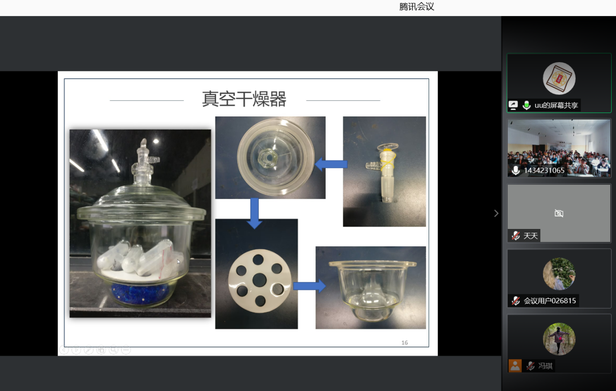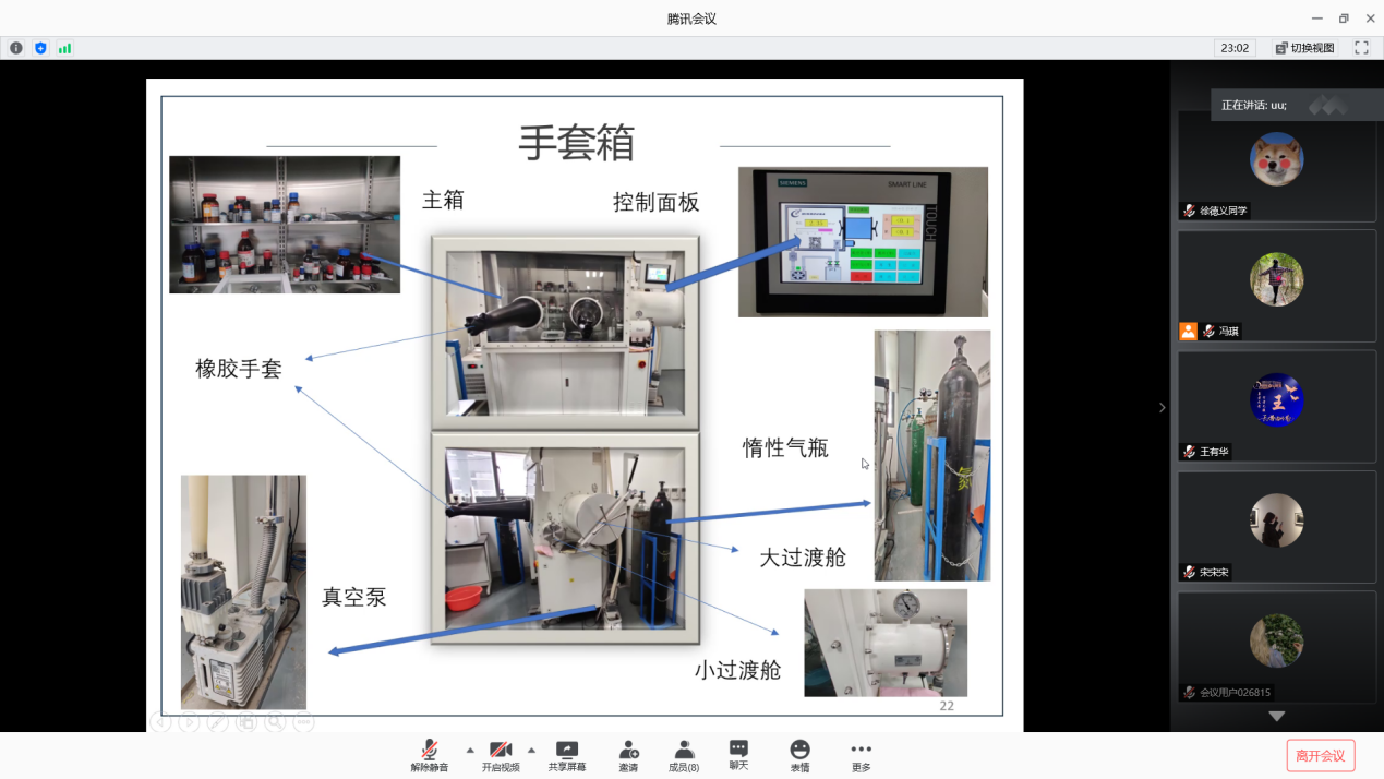 水分会对一些化学药品的性能产生影响,化学实验中的某些反应需要在真空或惰性气体保护下进行。为解决这些问题,真空干燥器和手套箱应运而生。吴威向同学们展示了实验室中常用的干燥器、双排管及手套箱,并详细介绍了手套箱的各部分组成及其功能。