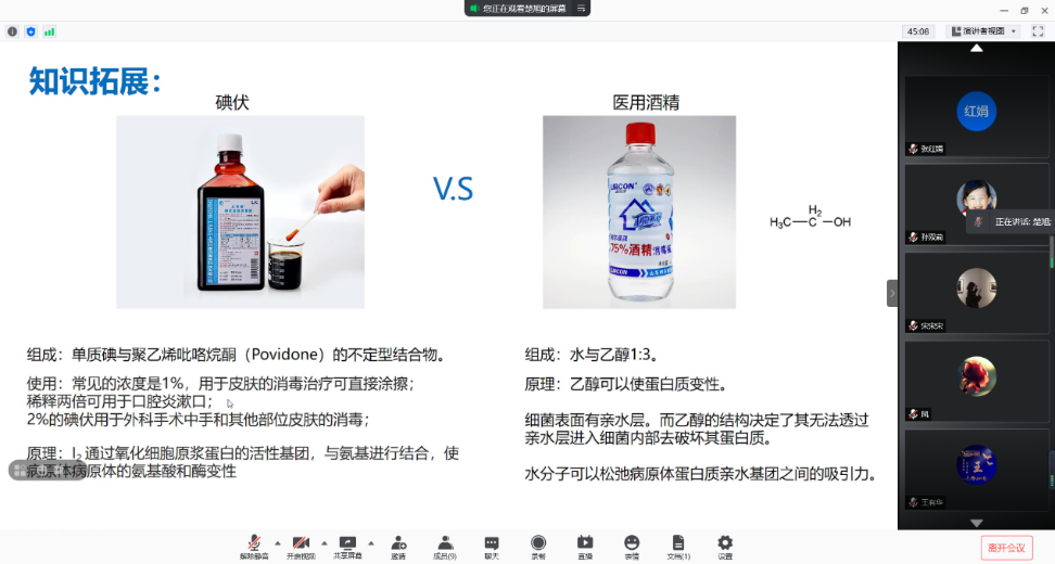 楚旭着重介绍了两种常见的消毒剂——碘伏与酒精。楚旭谈到,从消毒原理的角度来讲,前者通过氧化细胞原浆蛋白的活性基团与氨基进行结合,使病原体的蛋白质和酶变性,而后者的消毒原理在于其中的水分子可以松弛病原体蛋白质亲水基团之间的吸引力,从而使乙醇进入细菌内部,达到破环细菌蛋白质的效果。楚旭还通过具体的例证,介绍了划伤、割伤、烫伤、腐蚀或灼伤的处理方法。