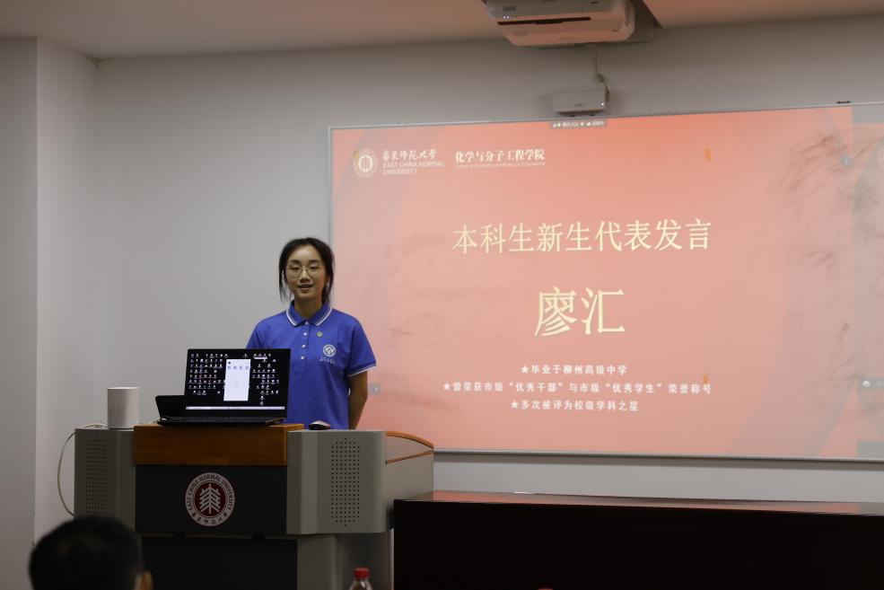 2019级化学非师范班沈珺同学作为高年级本科生代表,对新生们的到来也表达了热忱的欢迎。沈珺同学提醒新生们一定要充分利用学校提供的各种资源,不断明确自己的发展目标,做到有始有终;此外,也要不断尝试,尽快找到合适自己的方向;沈珺同学还提醒新生们要把握好老员工活中的每时每刻,以饱满的信心和热情迎接老员工活。