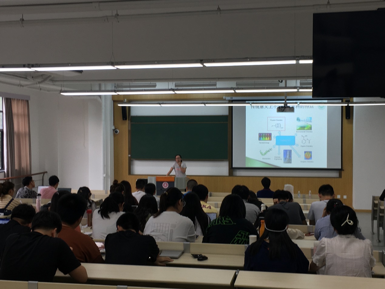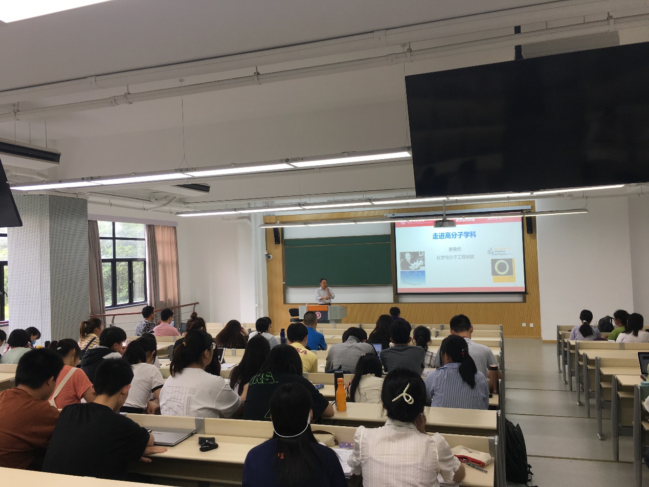 接着,是由高分子化学学科组的谢美然教授来向同学们介绍高分子化学。谢老师首先向大家介绍了高分子的发展历程,虽然高分子化学的发展自施陶丁格起仅有百年左右的时间,但如今我们的生活早已离不开各种各样的高分子。高分子化学不仅存在于日常生活中,在国防建设、工农业生产上也有着不可或缺的作用。随后,谢老师向同学们介绍了学院高分子化学的课题组及其研究方向,指出高分子化学的研究在未来有着巨大的发展空间,希望同学们能够进入到高分子化学的课题组,一起学习研究。