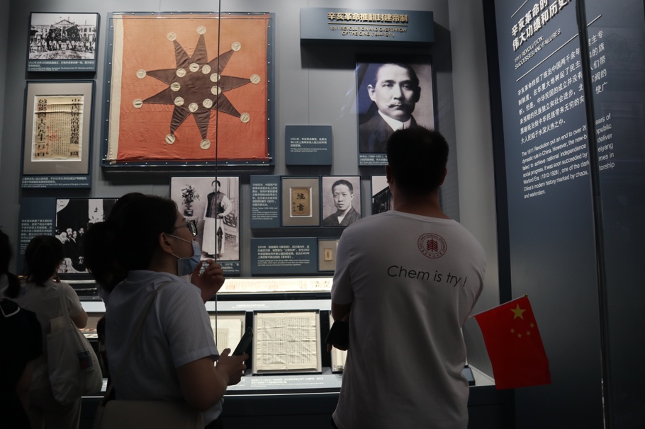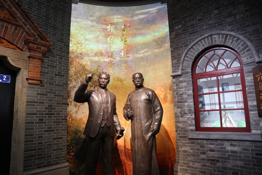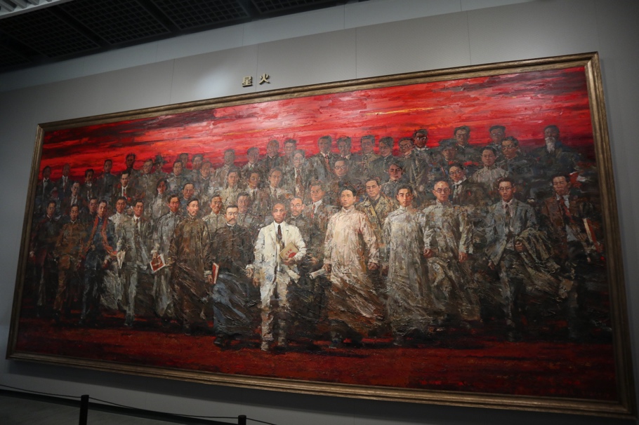 中共“一大”会址纪念馆设有“伟大的开端——中国共产党创建历史陈列”展览,踱步进入序厅,《日出东方》《民族脊梁》和《中流砥柱》三幅壁画映入眼中,其中,《日出东方》以天安门为中心展开,将中共一大会址、嘉兴红船、井冈山、瑞金苏维埃政府旧址、遵义会议会址等红色地标相贯通;《民族脊梁》则描绘了万里长城的雄伟壮阔;《中流砥柱》以屹立在黄河急流中的砥柱山为主体展现母亲河的壮丽景观。欣赏完三幅壁画,师生们乘坐电梯到达负一层,开启了考察实践的参观之行。