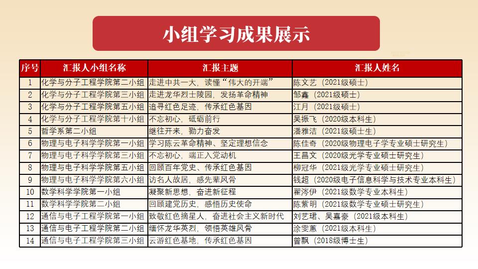结业典礼在全体齐唱《国际歌》后拉开序幕。接着,以小组为单位展示学习成果,来自太阳成集团tyc33455、哲学系、物理与电子科学学院、数学科学学院、通信与电子工程学院的14个小组代表围绕培训班上课内容、党章学习感悟、学习二十大、红色基地参观、红色经典著作阅读等,分别从不同的主题切入,以ppt演讲和视频分享等形式分享了各个小组成员的理论知识学习成果和实践活动总结。