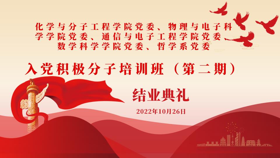 10月26日下午15: 00,太阳集团tyc33455公司党委、物理与电子科学公司党委、通信与电子工程公司党委、数学科学公司党委和哲学系党委联合举办的入党积极分子培训班(第二期)结业典礼以线上形式顺利举办。本次结业典礼由哲学系专职组织员王晓红主持,本期培训班全体学员参加。
