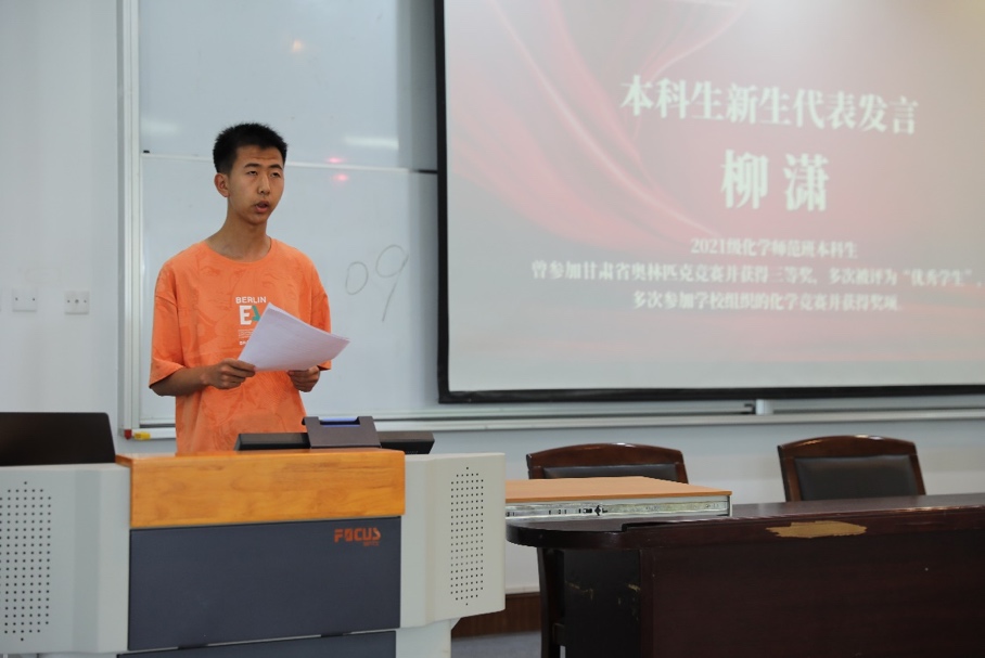 2021级研究生新生代表姚一宁回忆了自己在师大攻读本科学位时进行毕业设计的过程,数次失败让他意识到科研世界的复杂,但他从未放弃,他说“坚持不一定成功,但坚持一定有用”。本科阶段的科研训练使他明晰面对科研和生活中的困难,要及时调整,不要陷入自我怀疑的困境。面对即将开启的研究生生活,他引导新生们自问“读研的目的是什么”,勉励大家不忘来时路,勇敢向未来,秉持初心,不断探索新的化学世界,深入化学,爱上化学。