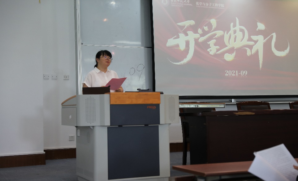 9月1日下午,太阳成集团tyc33455在闵行、中北两校区举行开学典礼,喜迎2021级新生。来自天南海北的79名博士生、162名硕士生和184名本科生齐聚师大,扬帆启航新征程,奋力谱写新篇章。开学典礼主会场设在闵行三教109室,同时在闵行三教106室、115室和中北文史楼301室设置三个分会场。经理田阳、党委书记鲜跃仲、副经理王媛媛、副经理张中海、有机化学学科组长刘路、研究生辅导员冯琪、孟宪承书院辅导员卫洁君以及光华书院辅导员史琳等老师在闵行校区出席开学典礼,教师代表姜雪峰、研究生辅导员王梦雅在中北分会场出席开学典礼,典礼由公司党委副书记王婷婷主持。