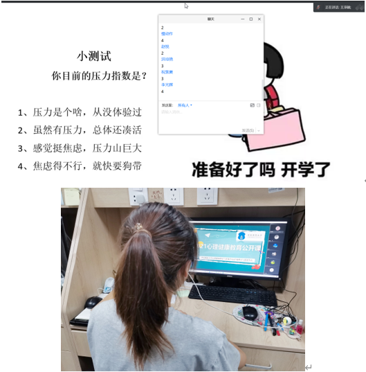 王老师首先从开学的压力讲起,指出同学们可能会因环境差异、人际关系、学习方式、理想与现实、发展目标等产生不同程度的焦虑和茫然感,告知同学们感受到压力、觉得焦虑是中性的情绪反应,可以跟朋友聊聊天、跑跑步、转移注意力,也可以寻求专业的心理帮助。随后,王老师详细讲述了“什么时候需要心理咨询”以及“同学中发现什么信号可建议其接受咨询”,提醒新生早日发现问题,解决问题,防止产生不良后果。