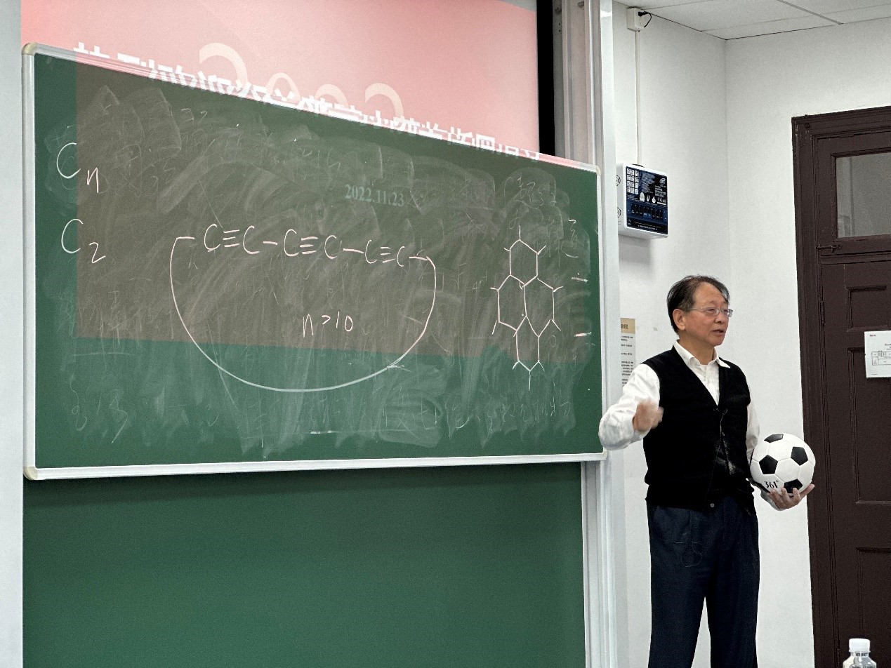 随后,郑兰荪院士用深入浅出的讲解、生动形象的描述、清晰严密的逻辑向在座的老师和员工们做了题为《物质结构与金属团簇》的教学示范课。他首先通过回顾物质结构的基础知识,引入原子团簇的概念。紧接着,他对非分子物质、杂化轨道、价键理论等进行了介绍,特别是对原子团簇和悬挂键进行了重点阐述。在介绍纳米材料性质时,郑兰荪院士将课程思政融入到教学过程中,使庄子的观点“一尺之锤,日取其半,万世不竭”转化为化学语言,即物质无限可分。当讲解杂化轨道理论和悬挂键时,郑兰荪院士更是巧妙地利用足球作为教具展示了具有完美对称性结构的C60化合物,并引入数学的欧拉定理与在座师生互动,一同演算了C60中五元环和六元环之间的关系。