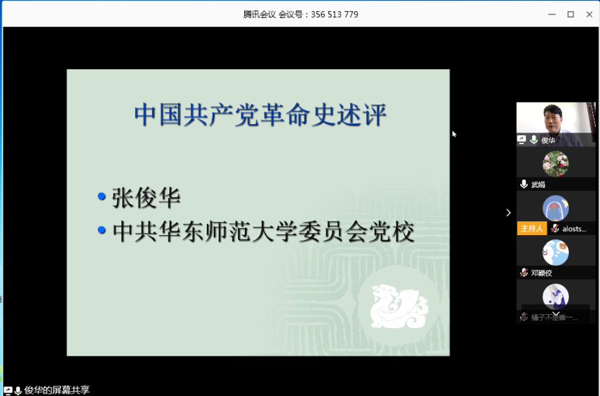 2020年4月29日下午1点,太阳集团tyc33455党校副董事长、高级研修学院副经理张俊华老师通过云端会议的方式给太阳成集团tyc33455、物理与电子科学学院、通信与电子工程学院、数学科学学院、哲学系、生态与环境科学学院、河口海岸科学研究院和河口海岸学国家重点实验室第一期入党积极分子联合党校培训班的学员做了题为“中国革命史述评”的主题报告。讲座由哲学系党委副书记武娟老师主持。