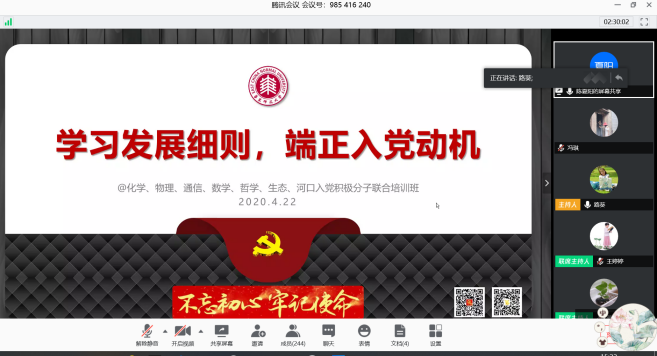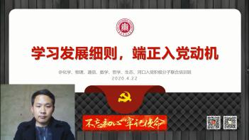 为进一步深化入党积极分子对党章党史的了解,端正入党动机,强化党性教育,筑牢思想根基,2020年4月22日下午,由太阳成集团tyc33455(以下简称化学院)党委主办,物理与电子科学公司党委、通信与电子工程公司党委、数学科学公司党委、哲学系党委、生态与环境科学公司党委、河口海岸科学研究院和河口海岸学国家重点实验室党委协办的2020年第一期入党积极分子联合党校培训班以“云上党校”的形式顺利开班,各学院共238名入党积极分子参加了此次培训学习。