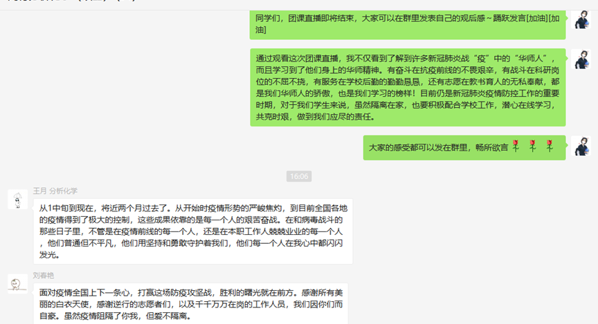 编者按:2020年3月11日下午,化学与分子工程学院青年团员在线上齐聚,共同观看“微光星河·‘华师大’新学期主题团课”直播,学习并发扬疫情防控中师大学子的责任与担当。在观看直播过程中,同学们表达最多的词语就是“感动”、“自豪”,他们感动于每一位华师人为疫情防控而忙碌的身影,动容于每一位青年用自己的肩膀汇聚起疫情阻击的坚实力量,同时,也为我们青年一代具有的责任感、使命感而自豪,为疫情防控中涌现的青年先锋者而骄傲。