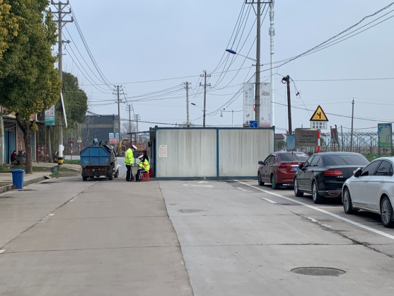 防控疫情的第一步就是阻止村内外人员的随意流动,因此,我们把村子的两个进出口都用障碍物封锁起来(如图,一辆货车堵住了进村的主要路口)。接着,每个村口每天都安排两个人把守,2小时一轮岗,严格管制人员流动。我也戴上了红色的小帽和袖标,在村口站岗,如若有人想进出村口,立即上前阻止。