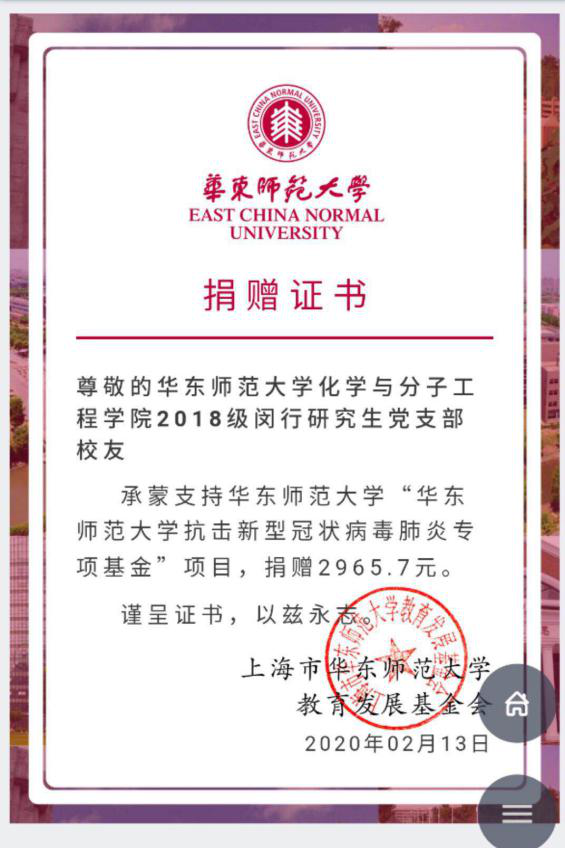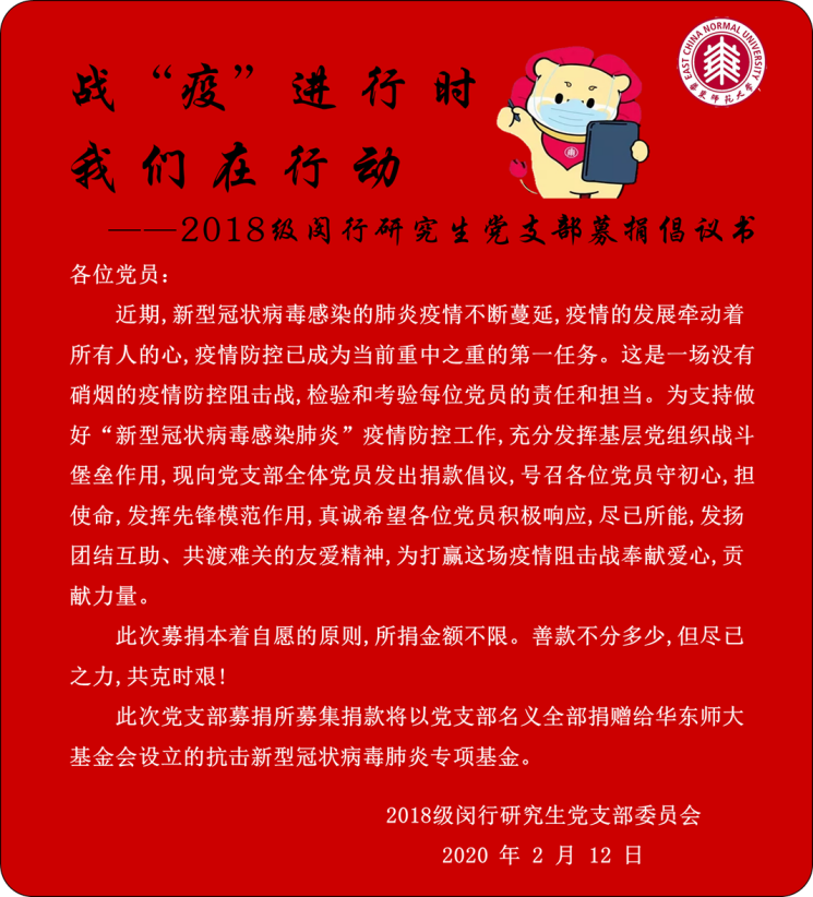 太阳成集团tyc334552018级闵行研究生党支部积极响应习近平总书记号召,在党支部书记孙双莉同志的带领下,发起了“战‘疫’进行时,我们在行动”爱心募捐活动,得到了同学们的积极响应。支部党员和入党积极分子携手同心,参与捐款52人,累计捐款2965.7元。支部所募集的捐款已悉数捐赠予华东师范大学教育发展基金会设立的“抗击新型冠状病毒肺炎专项基金”。