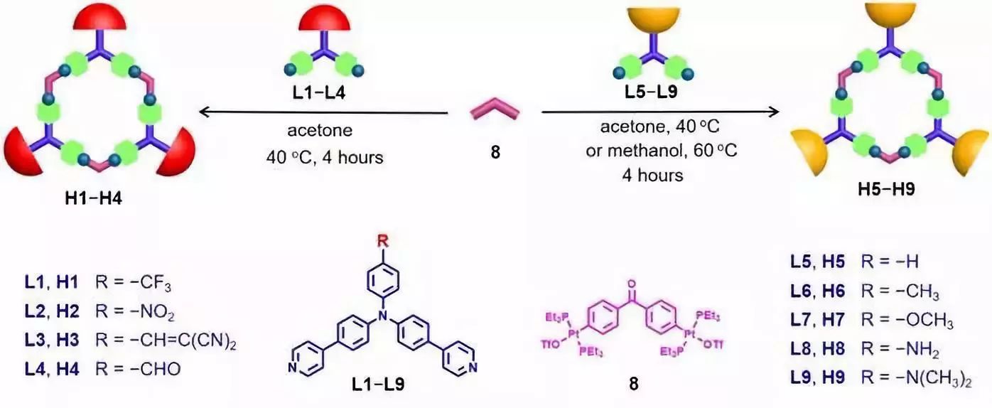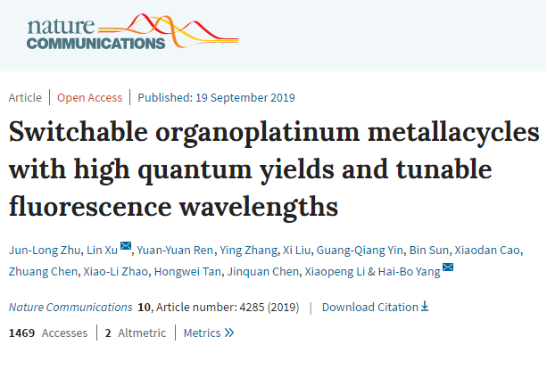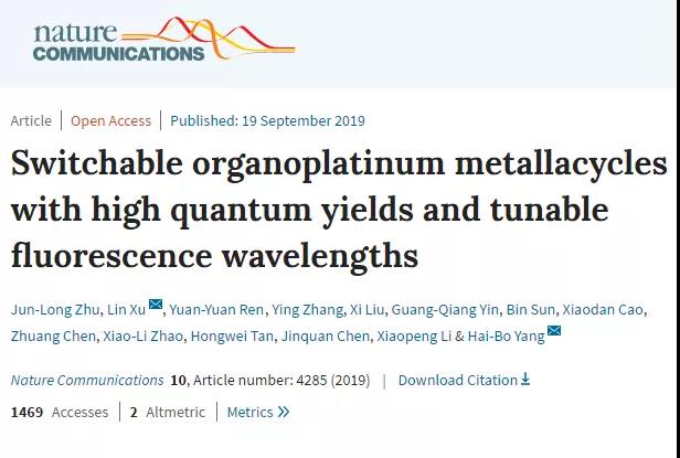这一项研究成果以“Switchable organoplatinum metallacycles with high quantum yields and tunable fluorescence wavelengths”为题发表在《自然·通讯》(Nature Communications)上(Nat. Commun., 2019, 10, 4285)。