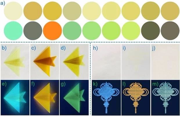 ● 基于超分子荧光金属组装体制备的可加工荧光薄膜和荧光喷墨打印材料例如,在肉眼观察下,所制备的材料为本底白色并不呈现任何图案,而在简单便携式荧光仪的照射下,所制备的材料立即呈现出不同颜色、强荧光的中国结图案。该系列超分子荧光材料有望实现在智能响应、信息存储和光信息防伪等领域的应用。