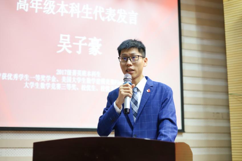 高年级本科生代表2017级化学菁英班吴子豪表示在大学期间应该寻找未来发展的方向,大学提供了丰富的资源,同学们可以大胆在大学尝试各种方方面面,但自由发展的同时也要尽快明确个人目标并为之不断努力。进入华师只是一个开始,好的结果还需要投入更多的努力,新时代青年应该继续努力,不负使命,争取为华师争光。