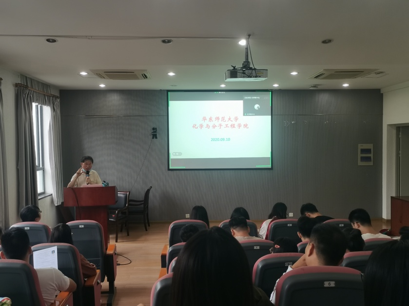 2020年9月17日下午,太阳成集团tyc33455老教授协会会长、院关工委委员、原化学系党总支书记王麟生教授在中北化学馆A205为化学院全体研究生新生讲解院史,闵行校区研究生新生在线观看直播,中北校区研究生新生在现场聆听,公司党委副书记王婷婷主持活动。