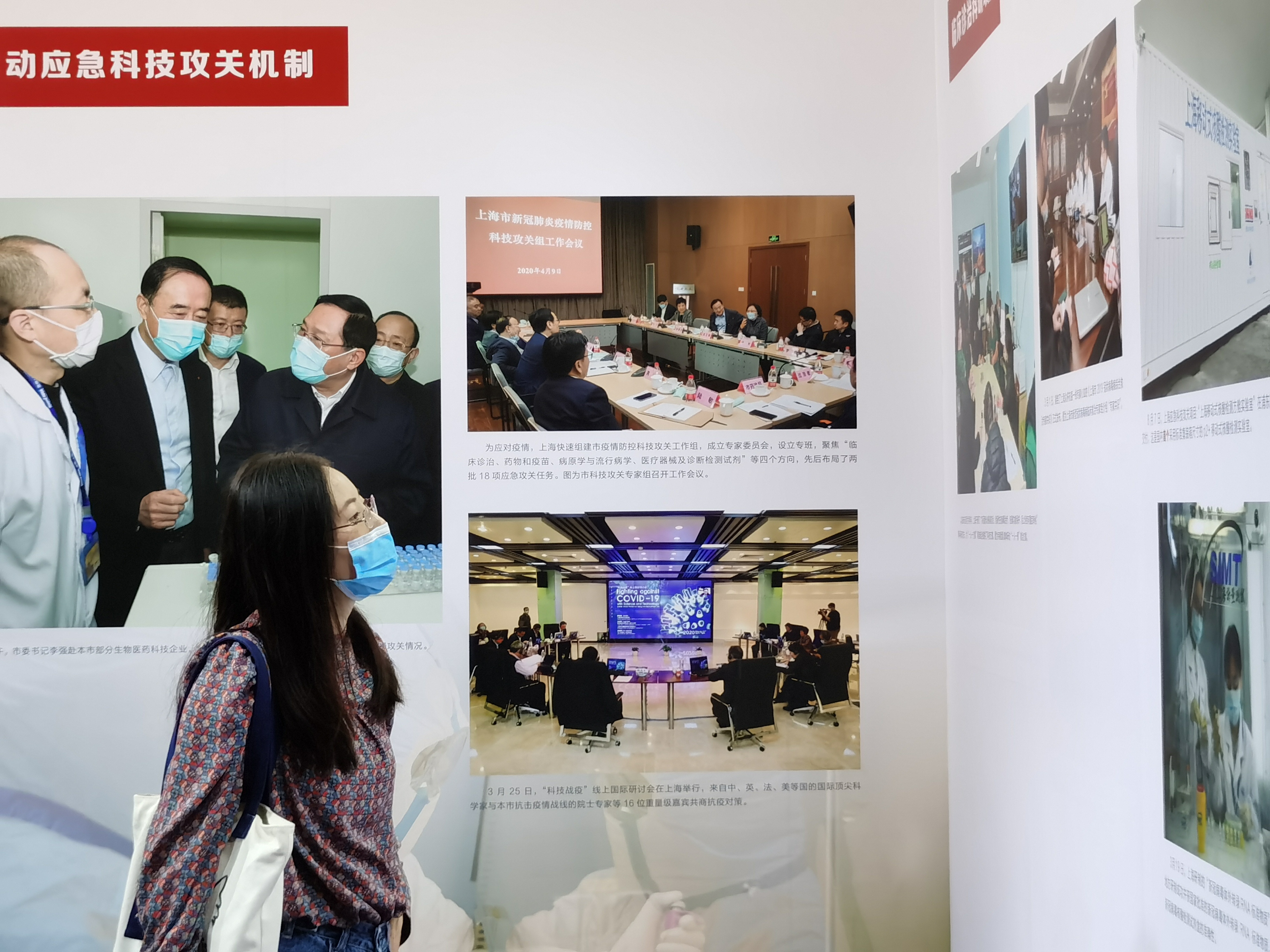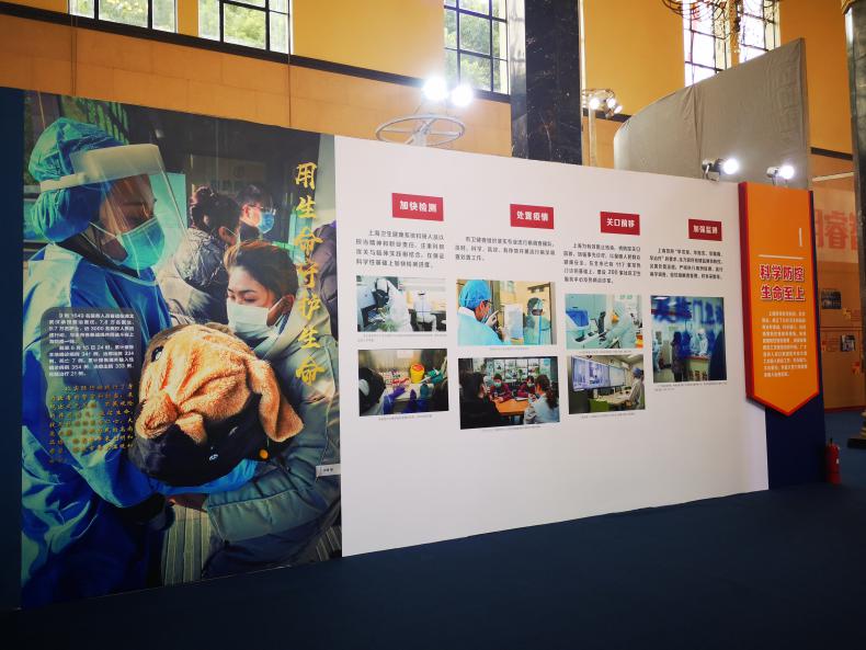 环绕展厅的墙壁上展示着的是习近平总书记在疫情期间做出的诸多重大指示。在重大公共卫生安全事件面前,以习近平总书记为总书记的党中央高度重视人民的生命健康安全,有条不紊地下达各项行动指示,全国各地各级党组织全面行动,共同抗疫。上海市市委、市政府积极响应党中央的指示,高度配合,带领人民顺利取得上海市抗疫阻击战的胜利。全体党员与非党员怀着崇高的敬意观看了系列讲话和视频。