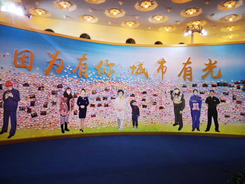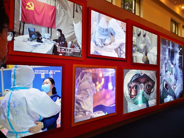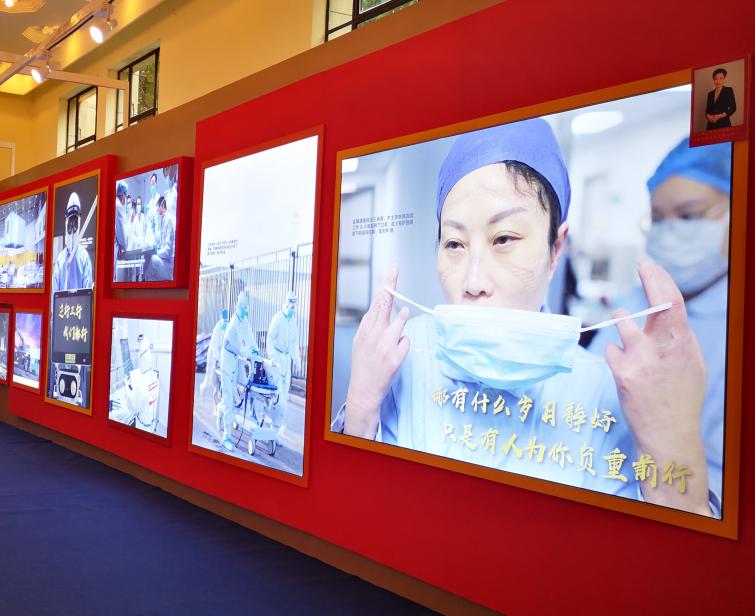 迈过庄重的大门,首先映入眼帘的LED屏上,播放着抗击新冠疫情人民战争、总体战、阻击战打响时党中央采取的重大举措,展示了党和国家在艰苦卓绝的历史大考向人民交出的抗疫答卷。大门两侧是“倾城抗击”和“举国战疫”的版块介绍,“人民至上,生命至上”的理念体现在抗疫过程中的方方面面,渗透在展览中的每个细节。